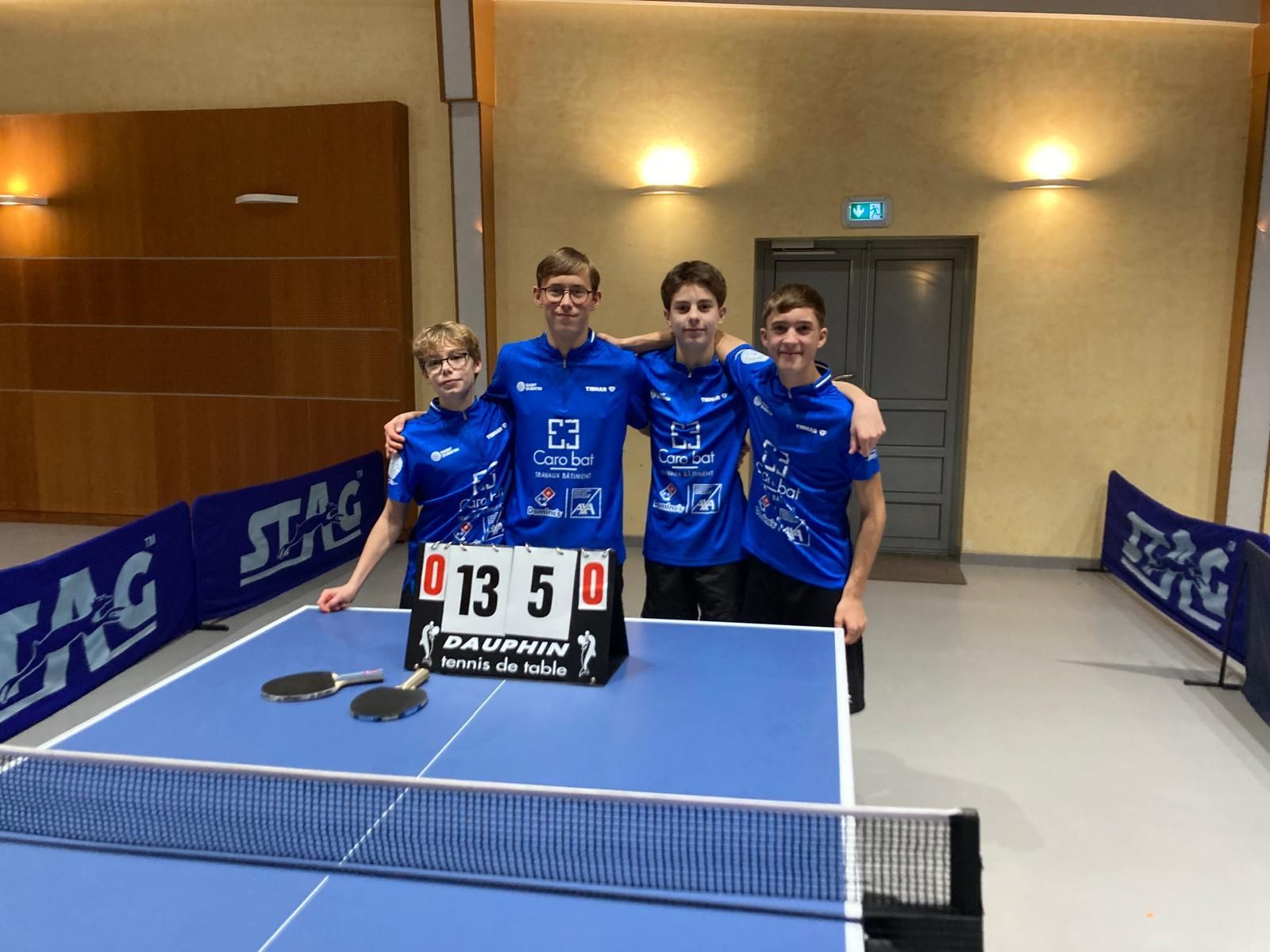 Lors cette dernière journée de première phase, seule l’équipe 2 masculine a assuré son maintien en Nationale 2 par une belle victoire à l’extérieur. Les 3 autres équipes du TT Saint-Quentin ont dû logiquement s’incliner. PRO B : TTSQ 2 / UNION ISSY ANTONY : 1 / 3 Contre l’Union Issy/Antony qui joue le titre et la montée en Pro A pour la phase retour, l’équipe réserve du TTSQ a de nouveau sauvé l’honneur par l’incontournable Agnès Le Lannic. Ses coéquipières Emily Bolton et Jeanne Mathieu n’ont rien pu faire contre des adversaires bien mieux classées et TTSQ2 entamera la phase retour de la Pro B comme lanterne rouge, loin derrière l’équipe classée avant-dernière de ce championnat à 14 journées. Les résultats : SAINT-QUENTIN 2 : Agnès Le Lannic N°69 (1 victoire / 1 défaite) Emily Bolton N°139 (0 victoire / 1 défaite) Jeanne Mathieu N°196 (0 victoire / 1 défaite) UNION ISSY ANTONY : Elise Pujol N°81 (2 victoires / 0 défaite) Léonie Hartbrich N°72 (1 victoire / 0 défaite) Ainhoa Cristobal N°99 (1 victoire / 0 défaite) NATIONALE 1 - Poule 1 : TOURS 4S 2 / TTSQ 1 : 8 / 1 Encore privée de son leader portugais, remplacé par François Desteuque, l’équipe fanion masculine du TTSQ s’est lourdement inclinée pour sa dernière sortie en Nationale 1. Seul le capitaine Clément Drop a pu sauver l’honneur et, comme on pouvait le craindre, son équipe va démarrer la seconde phase de la saison en Nationale 2. Les résultats : TOURS 4S 2 : Élian Mousseaut N°212, Evan Leriche N°217, Titouan Morel-Gonzales N°510 (tous 2 victoires / 0 défaite) Matthieu Pigner N°306 (1 victoire / 1 défaite) TT SAINT-QUENTIN : Clément Drop N°226 (1 victoire / 1 défaite) Samuel Da Silva N°356, Émilien Bourdon N°369, François Desteuque 1930 (tous 0 victoire / 2 défaites) NATIONALE 2 - Poule 5 : CP QUEVILLY / TTSQ 2 : 3 / 8 Malgré l’absence de l’Anglais Rohan Dani et la perte des 2 doubles, la réserve saint-quentinoise est allée chercher une net succès (8/3) à Quevilly. Pour cela, il a fallu perfé à l’image du Portugais Rafael Silva sur les N°202, N°462 et N°498, de Loïc Havard sur les N°462 et N°498 ainsi que du capitaine Corentin Bruyelle sur le leader adverse N°202. Grâce à ces 6 performances individuelles sur 9 parties gagnées, TTSQ2 termine 5e de la poule 5. Les résultats : CP QUEVILLY : Éric Varin N°202 (1 victoire / 2 défaites) Corentin Lemire N°498 (0 victoire / 2 défaites) Ludwig Leseigneur N°557 (0 victoire / 2 défaites) Quentin Pradelle N°462 (0 victoire / 3 défaites) plus les 2 doubles Varin-Lemire et Leseigneur-Pradelle TT SAINT-QUENTIN 2 : Corentin Bruyelle N°446 (3 victoires / 0 défaite) Rafael Silva N°600 (3 victoires / 0 défaite) Loïc Havard N°648 (2 victoires / 0 défaite) Lucas Bourlet N°603 (1 victoire / 1 défaite) moins les 2 doubles Bruyelle-Bourlet et Silva-Havard NATIONALE 3 - Poule 12 : TTSQ 3 / AC PLÉRIN 2 : 1 / 8 Après avoir poussé à la belle le leader numéroté N°736, Charles Quinet a marqué le seul point saint-quentinois en perfant sur le classé 18. Pour terminer la première phase et éviter le forfait, il a fallu faire appel à 2 remplaçants : merci à Jean-Baptiste Carlier et Antoine Dhollande. TTSQ3 termine ainsi 8e et descend en PréNationale pour la seconde phase. Les résultats : TT SAINT-QUENTIN 3 : Charles Quinet 1764 (1 victoire / 1 défaite) Louis Quinet 1823, Jean-Baptiste Carlier 1643, Antoine Dhollande 1401 (tous 0 victoire / 2 défaites) AC PLÉRIN 2 : Baptiste Bourget N°736, Guillaume Le Louarn 2037, Anselme Gueguen 1943 (tous 2 victoires / 0 défaite) Clément Bourget 1824 (1 victoire / 1 défaite)