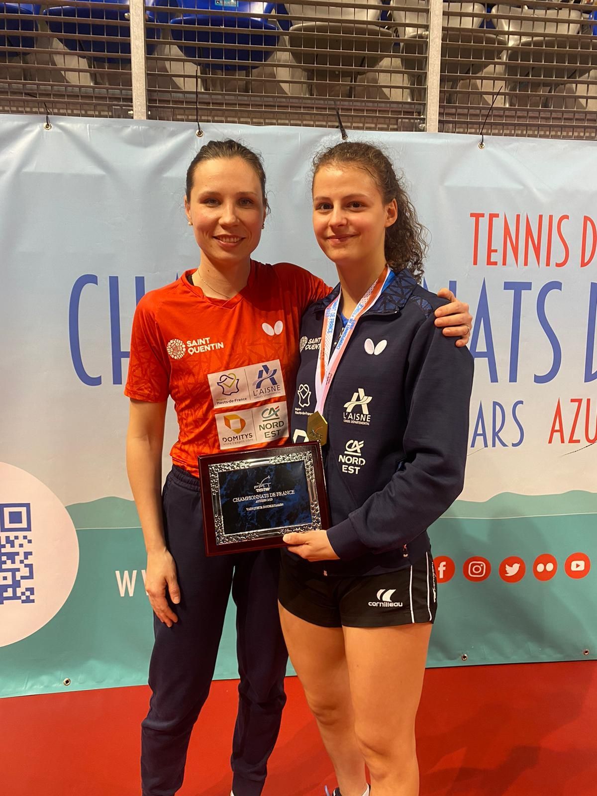 Avec le coaching d’Olga Mikhaylova, la Saint-Quentinoise Camille Lutz a obtenu ce samedi le titre de Championne de France Double Dames 2023 avec, comme la saison dernière, sa coéquipière de l’équipe de France, Prithika Pavade, la Championne de France Senior 2022 qui s’est fait éliminer en simple dès les quarts de finale. Malheureusement, Camille n’a pu faire mieux et s’est inclinée en 7 manches contre Élise Pujol après avoir mené 3 manches à 1 et avoir perdu la 6e aux avantages à 14/16 ! La jeune internationale du TTSQ aurait même pu l’emporter 4 manches à 0, ayant perdu la 2e également aux avantages par 10/12. Après ses titres en Double Dames et Double Mixte 2022, Camille Lutz va repartir d’Antibes avec une nouvelle médaille d’or. Félicitations !
