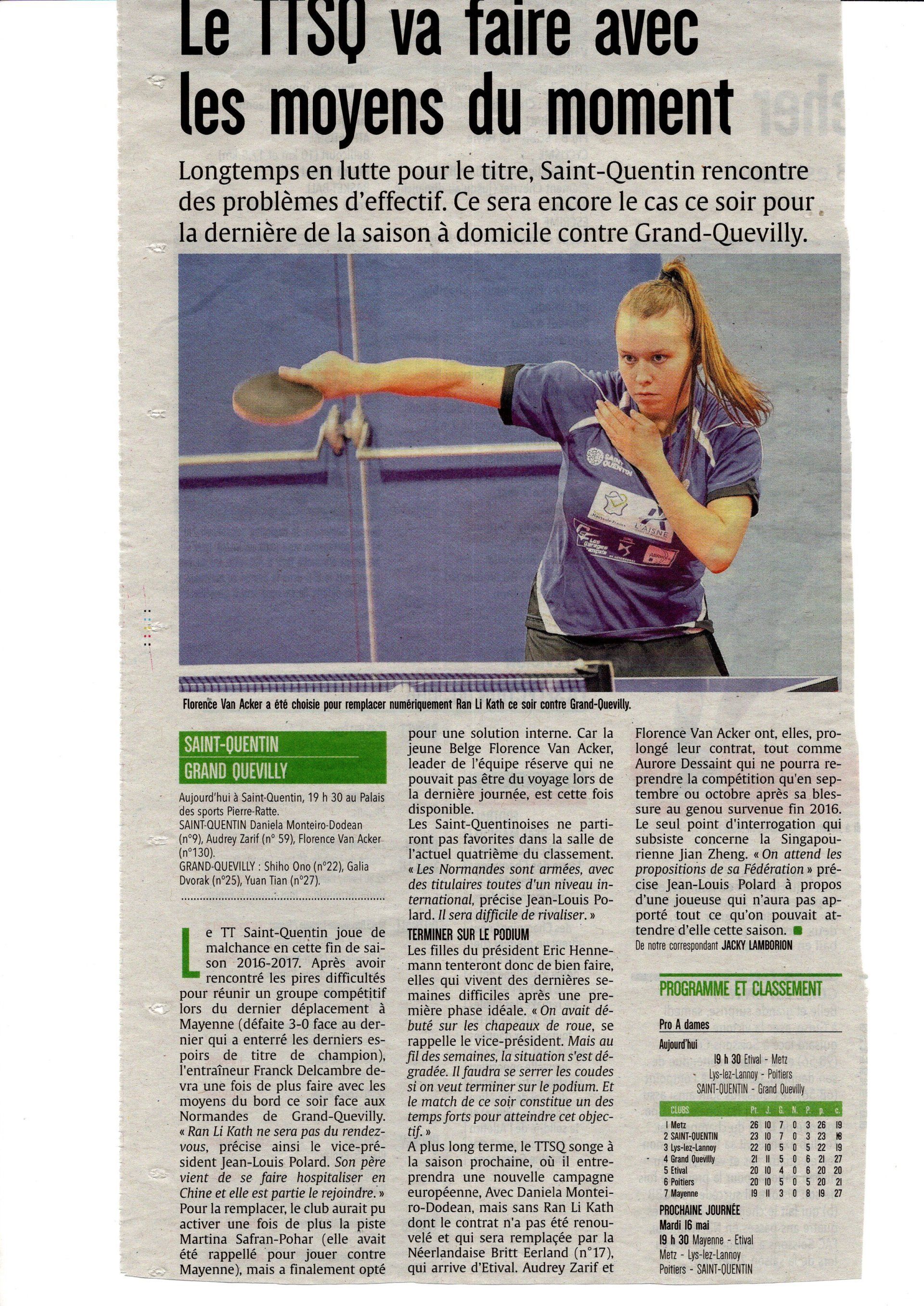 Florence Van Acker, née le 18 mars 1997, est une joueuse belge qui est venue renforcer avec bonheur l’équipe 2 du TTSQ en Nationale 2. En 2017, elle a été la meilleure joueuse de son équipe avec 25 victoires sur 32 parties (78,1%). Elle a été Championne de Belgique Double féminin en Moins de 21 ans et aussi médaille de bronze aux Championnats de Belgique Double Seniors Dames en 2017.
