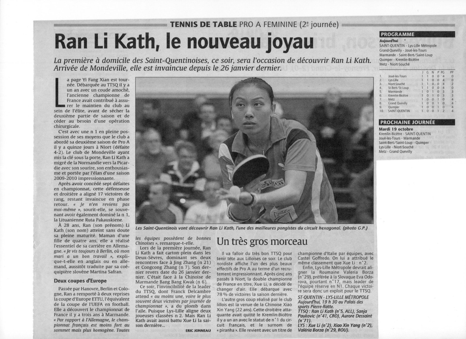 Ran Li Kath, née le 7 juillet 1982, est arrivée en 2000 en Allemagne où elle a joué à Berlin. En tant que Li Ran, elle a gagné 2 fois la Coupe d’Europe ETTU avec son club 3B Berlin : en 2001-2002 en compagnie de Ruta Budiene-Paskauskiene et en 2003-2004. Elle est venue ensuite jouer en France, d’abord à Marmande puis à Mondeville avant Saint-Quentin. Depuis 2015, elle a les pris des fonctions d’entraîneur au club allemand de Glienicke qu’elle occupe maintenant à plein-temps.