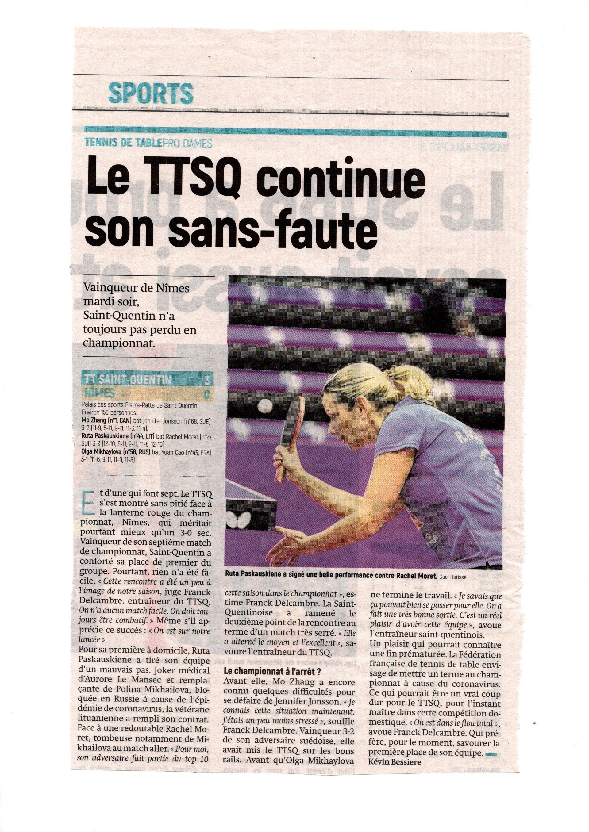À Saint-Quentin, c’était la moitié du chemin et le TTSQ n’a pas su limiter les dégâts à Carthagène. Ce qui avait été évoqué et redouté s’est hélas déroulé. L’équipe saint-quentinoise a perdu par 2 manches à 0 lors de l’épreuve du ‘golden match’ en ‘extra time’. -D’entrée, Linda Bergström N°53 mondiale se faisait dominer par Maria Xiao N°74 et perdait en 3 manches sèches. Score au tableau d’affichage : 0 / 1 . -La deuxième partie opposait Tin-Tin Ho N°174 à Polina Mikhailova . Comme sa coéquipière, la Russe de Saint-Quentin avait beaucoup de mal à s’adapter à la table et à la salle. Elle arrachait le droit à la belle par 12/10 dans la 4e manche et l’emportait 6/4 dans la 5e. Égalisation au score de la rencontre : 1 / 1 . - Camille Lutz N°80 avait le 2e point du TTSQ à portée de raquette pour tuer le match, mais contre la Chinoise Qi Fei , elle concédait trop rapidement les 2 premières manches (7/11). Elle arriver à mener pour la 1ère fois de la partie à 3/2 dans la 3e manche et se détachait rapidement (/3) pour l’emporter. Le banc saint-Quentinois et les internautes commençaient à y croire quand Camille a mené 6/1 puis 7/2. Elle ratait malheureusement sa balle de set à 10/9 et perdait aux avantages (10/12). Le TTSQ était de nouveau mené : 1 / 2 . - Polina Mikhailova revenait à la table pour affronter Maria Xiao N°74 . Si la Saint-Quentinoise égalisait à 2/2, la rencontre était pliée avec la qualification ! Si elle perdait, ce serait le ‘golden match’ tant redouté. Sous la pression, Polina craquait en fin de 1ère manche, perdant de 7/5 à 7/11. Réveillée par sa compatriote Olga Mikhaylova , elle s’envolait (7/0) pour gagner 11/6. Un mauvais départ dans la 3e manche (0/3) devenait irrattrapable : 2/6, 3/8 et 6/11. À l’inverse, la 4e manche démarrait bien (3/0) et Polina l’emportait 11/7 pour disputer une nouvelle belle en 6 points. Elle menait 3/2 et encore 4/3, mais concédait consécutivement les 3 derniers points : 4/6. Score final de la rencontre retour : 1 / 3 . Golden match : nouvelle feuille de match : Les 2 capitaines donnaient la nouvelle composition de leurs joueuses pour disputer chacune 1 manche en 11 points. -Polina Mikhailova (NC) démarrait contre Qi Fei (NC) et prenait un départ catastrophique (0/5). Elle revenait cependant à 5/5 et arrivait à mener 10/8 avec 2 balles de set ! À 12/11, elle passait à côté de la victoire et se faisait dépasser aux avantages : 13/15. Cruel ! Score : 0 / 1 . -Toute la pression était mise alors sur Linda Bergström pour donner l’occasion à Camille Lutz de disputer le 3e et dernière manche décisive. La Suédoise rencontrait de nouveau l’Espagnole Maria Xiao . Les 2 joueuses ne se quittaient pas de plus d’1 point d’écart jusque 5/5, mais à 6/5 la malheureuse Linda calait et encaissait les derniers points : 6/11. C’était fini. 0 / 2 . C’est la 3e fois en 3 saisons de suite que le TTSQ dispute le golden match en ¼ de finale : défaite à Saint-Quentin contre Linz (1/3, 3/1 et 2 manches à 1) en 2024, victoire à Linz (0/3, 3/0 et 2 manches à 0) en 2025 et défaite à Carthagène (0/3, 3/1 et 2 manches à 0) en 2026. LE QUART DE FINALE ALLER-RETOUR : Résultat de ce samedi 14 février 2026 : UCAM Carthagène-TTSQ : 3 / 1 (P) Maria Xiao N°74 bat Linda Bergström N°53 :11/6 11/611/9 (P) Polina Mikhailova (NC) bat Tin-Tin Ho N°174 : 6/11 11/3 5/11 12/10 6/4 (P) Qi Fei (NC) bat Camille Lutz N°80 : 11/7 7/11 11/8 12/10 Maria Xiao N°74 bat Polina Mikhailova (NC) :11/7 6/11 11/6 11/7 6/4 Golden match : UCAM Carthagène bat TTSQ : 2 manches à 0 Qi Fei (NC) bat Polina Mikhailova (NC) : 15/13 Maria Xiao N°74 bat Linda Bergström N°53 : 11/6 Résultat du mercredi 11 février 2026 : TTSQ-UCAM Carthagène : 3 / 0 Polina Mikhailova (NC) bat Maria Xiao N°74 : 11/6 11/8 10/12 11/3 Linda Bergström N°53 bat Qi Fei (NC) : 11/7 11/8 11/7 Camille Lutz N°80 bat Tin-Tin Ho N°174 : 11/9 11/8 9/11 11/7