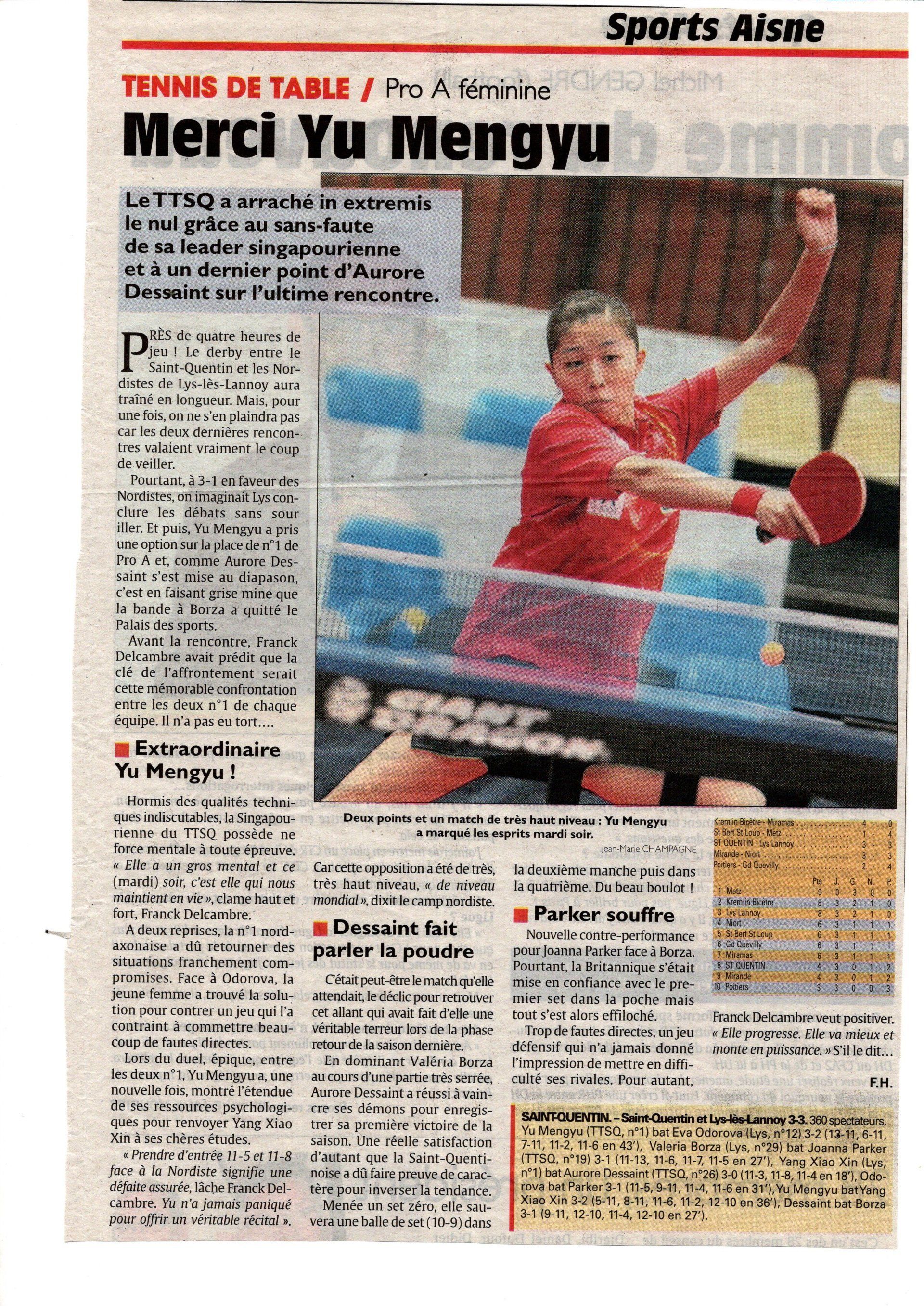 Après Ran Li Kath, classée N°4 en 2012, Yu Mengyu est arrivée au club avec le meilleur classement jamais obtenu jusque là par un(e) sociétaire du TT Saint-Quentin : N°1 en France !