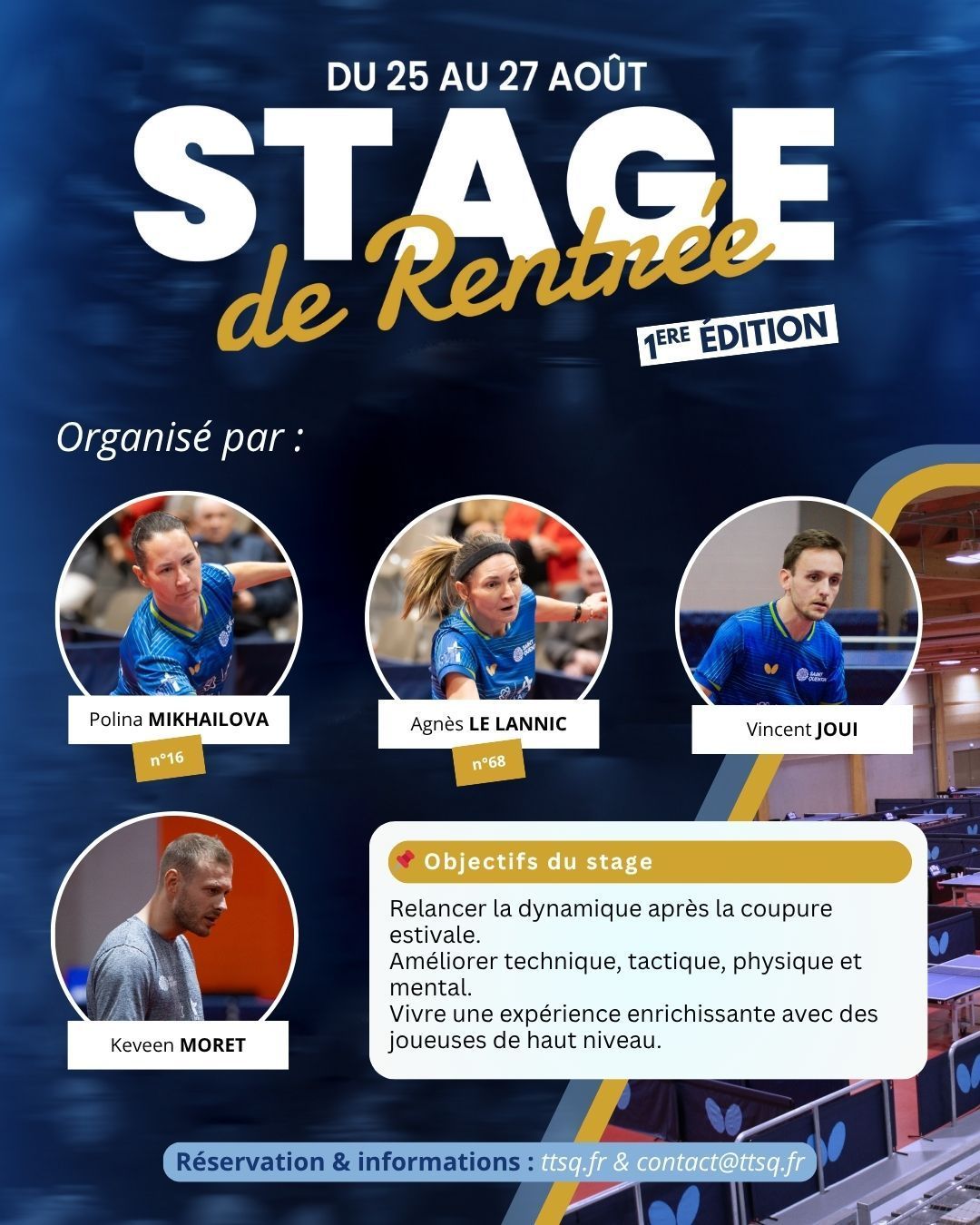 Prépare ta saison avec le stage de rentrée du TTSQ en août, dans l’une des plus belles salles de France ! Encadré par les pros Polina Mikhailova, Agnès Le Lannic,