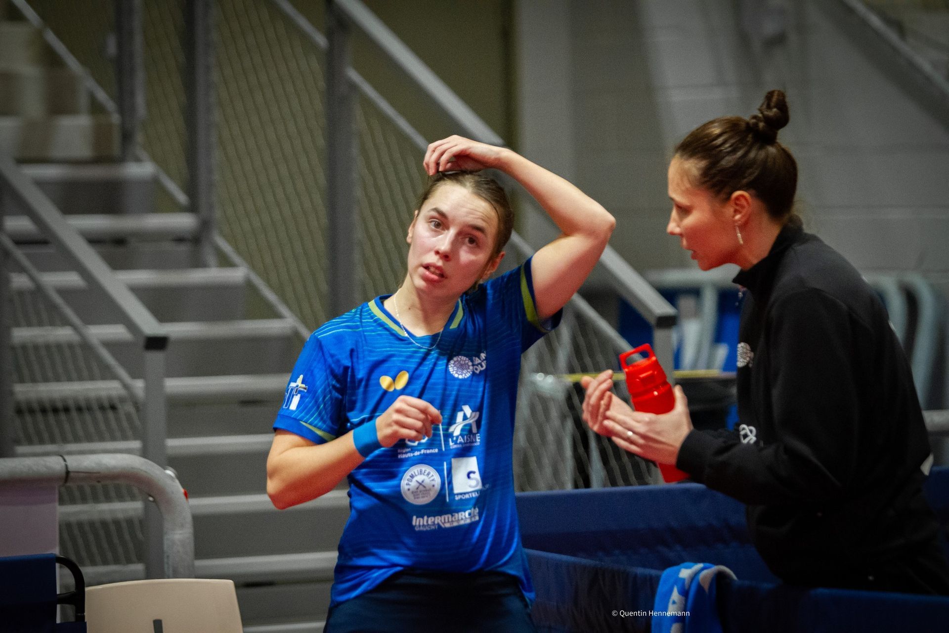 -Malgré la pression, car battue la saison dernière par Anaïs Salpin N°32 aux France 2025, Camille Lutz N°25, Championne de France 2024, obtenait sa revanche en 3 à 0. Après 2 manches serrées à 11/9 et une expéditive à 11/4, le TTSQ égalisait : 1 / 1.