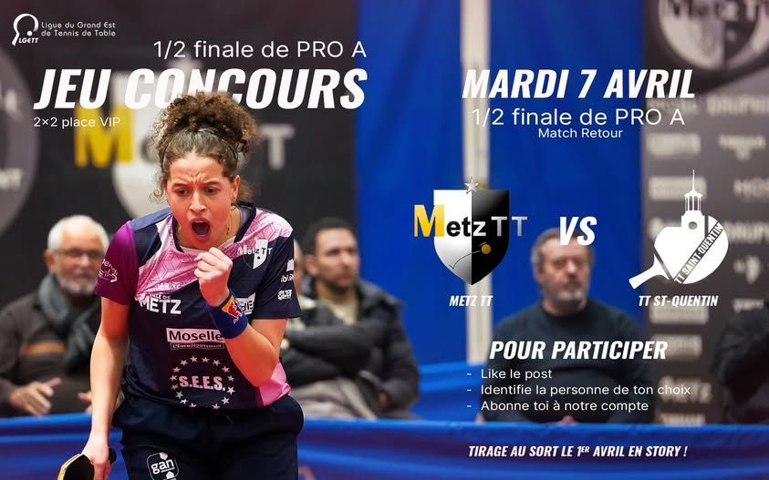Pour cette rencontre retour, le TT Saint-Quentin n’a pas les faveurs des pronostics après sa nette défaite (1/3 à domicile) contre le tenant du titre. Le TT Metz, de nouveau qualifié pour la 2e année consécutive dans le carré d’as à la fois au niveau national et au niveau européen, a l’objectif d’obtenir un doublé retentissant. Le club y croit car le TT Metz a de gros moyens financiers et a pu, par conséquent, encore recruter et constituer une équipe de rêve composée de 5 joueuses internationales, toutes numérotées mondiales dont 2 dans le Top 50 : -Hana Goda N°2 , internationale égyptienne, est triple Championne d’Afrique. En Pro A, elle en est à 84,6% de victoires : 11 pour 2 défaites contre Poitiers (Jianan Yuan N°3 et Jiaduo Wu N°21). Le nouveau leader de Metz montre la voie vers les 2 finales espérées de la saison. -Adina Diaconu N°12, internationale roumaine, vient d’être Vice-Championne de Roumanie 2026 en Simple et en Double Dames. Elle a été finaliste du WTT Star Contender en Double Dames au Qatar il y a 2 ans. Adina n’a pas disputé la ½ finale aller à Saint-Quentin. -Mariia Tailakova N°15, internationale russe, a été la meilleure joueuse de Pro A en 2023-2024 et 2024-2025. Cette saison, elle a subi 4 défaites contre Océane Guisnel N°23, Hana Harapovic N°26, Championne de Croatie 2026… et Camille Lutz N°27 (2 fois) ! -Charlotte Lutz N°17, internationale française, a été Vice-Championne de France Seniors en 2023 et 2024, Championne de France Double Mixte 2025. Elle a un pourcentage de victoires de 85,7% en Pro A avec 1 seule défaite contre Léana Hochart N°32. Elle a perfé à l’aller sur Linda Bergström N°7. -Sarah De Nutte N°41, internationale, vient d’être Championne du Luxembourg 2026 en Simple pour la 12e fois ainsi qu’en Double Dames. Dans l’équipe de Metz, elle est la 5e joueuse, mais Sarah a su perfer sur Liu Hsin Ying N°20, Isa Cok N°31 et Audrey Zarif N°38 sur 6 parties jouées en phase régulière. Pour l’équipe saint-quentinoise d’ Olga Mikhaylova , les rencontres à Metz tournent souvent mal. Linda Bergström, Polina Mikhailova, Barbora Varady et Camille Lutz le savent bien, mais elles n’ont rien à perdre et ne peuvent que créer la surprise. Bilan individuel de Metz contre le TTSQ : -Hana Goda n’a jamais perdu contre le TTSQ ces 2 dernières saisons, mais Polina Mikhailova l’a poussée à la belle le 18 mars. -Mariia Tailakova a déjà perdu contre Camille Lutz (2 fois), Linda Bergström (2 fois) et Polina Mikhailova. -Charlotte Lutz a déjà perdu contre Camille Lutz et Linda Bergström. -Adina Diaconu a déjà perdu contre Polina Mikhailova. Alors, peut-être ! Rendez-vous mardi 7 avril 2026 à 19h30 sur YouTube FFTT. RAPPEL : Résultats de la ½ finale aller TTSQ-Metz- du mercredi 18 mars 2026 : 1 / 3 (P) Camille Lutz N°27 bat Mariia Tailakova N°15 : 8/11 11/6 11/3 11/7 Hana Goda N°2 bat Polina Mikhailova N°14 : 11/8 9/11 11/4 4/11 11/7 (P) Charlotte Lutz N°17 bat Linda Bergström N°7 : 11/8 10/12 11/9 12/14 11/8 Hana Goda N°2 bat Camille Lutz N°27 : 11/4 12/10 11/9 Le déroulé de la rencontre pour le TTSQ : 1/0 - 1/1 - pause - 1/2 - 1/ 3 (P) Performance sur une joueuse mieux classée