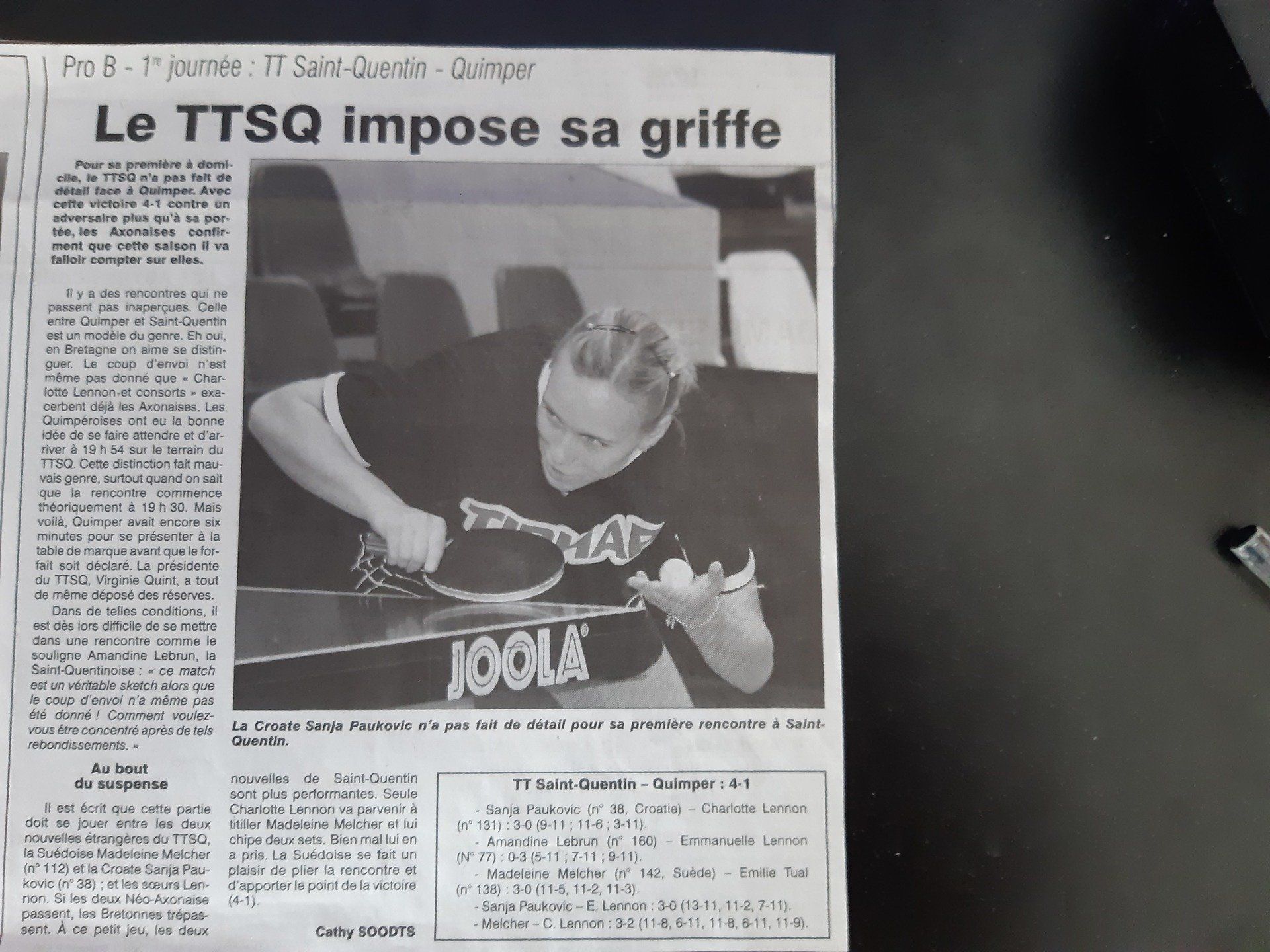 L’équipe féminine du Tennis de Table de Saint-Quentin est passée à travers de sa première rencontre européenne à domicile contre l’équipe espagnole moins bien cotée. La rencontre a été âpre avec 11 manches sur 15 différenciées de 2 petits points ! Fait très rare : les 4 parties ont vu à chaque fois les 2 premières manches se terminer par 11//9, 12/10 ou 13/11 ! Chaque manche pouvait basculer d’un côté ou de l’autre et les Saint-Quentinoises n’ont pas été les plus heureuses. Pour le club espagnol, les joueuses néophytes en Champions League ont su saisir leurs chances. À l’issue de cette première rencontre décevante, la solution est simple : il faudra gagner 3/0 ou 3/1 (avec un bon set-average) le vendredi 16 janvier 2026 à Reus en Espagne. Mais en attendant il va falloir se ressaisir dès ce vendredi à Grand-Quevilly chez les Championnes de France Pro B avec à leur tête la Vice-Championne de France Senior 2025, Anaïs Salpin. Le mois de janvier va être très riche en rencontres : à Quimper le 6 , contre l’Entente St Pierraise le 9 , à Étival le 11 , contre Tarnobrzeg le 13 et les retrouvailles chez Miro Ganxets le 16 . Les résultats : Barbora Varady WR N°100 bat Olga Vorobeva (NC) : 11/9 12/10 11/5 (P) Guo Ruichen (NC) bat Linda Bergström WR N°43 : 9/11 11/9 11/6 11/6 Anastasia Kolish (NC) bat Polina Mikhailova (NC) : 9/11 12/10 11/9 11/9 (P) Guo Ruichen (NC) bat Barbora Varady WR N°100 : 13/11 9/11 13/11 11/7 L’évolution du score pour le TTSQ : 1/0 - 1/1 - 1/2 - 1/3 Rappel des résultats de la poule A : La feuille de match du samedi 15 novembre 2025 : KTS Tarnobrzeg-TT Saint-Quentin : 3 /0 Xiaoxin Yang ER N°43 bat Agnès Le Lannic (NC) : 11/8 11/5 11/4 Ying Han WR N°22 bat Linda Bergström WR N°59 : 11/8 11/6 11/7 Yu Fu WR N°58 bat Polina Mikhailova (NC) : 11/5 11/2 13/11 La feuille de match du mardi 11 novembre 2025 : Miro Ganxets-KTS Tarnobrzeg : 0/3 Ying Han WR N°22 WR bat Guo Ruichen (NC) : 13/11 10/12 11/6 11/4 Xiaoxin Yang N°43 ER bat Olga Vorobeva ER N°346 : 11/9 11/7 11/8 Yu Fu WR N°58 bat Andrea Todorovic WR N°171 : 11/4 11/8 11/5 (WR : classement mondial, ER : classement européen, NC : Non Classée)