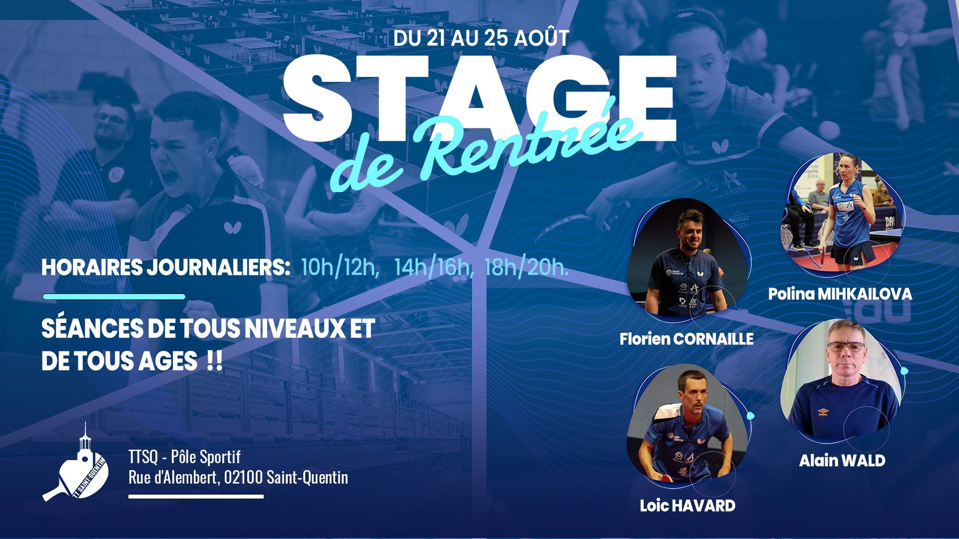 Du lundi 21 au vendredi 25 août, les licenciés du TTSQ auront l'occasion de se préparer pour la reprise du championnat et de se familiariser avec leur nouvelle salle.